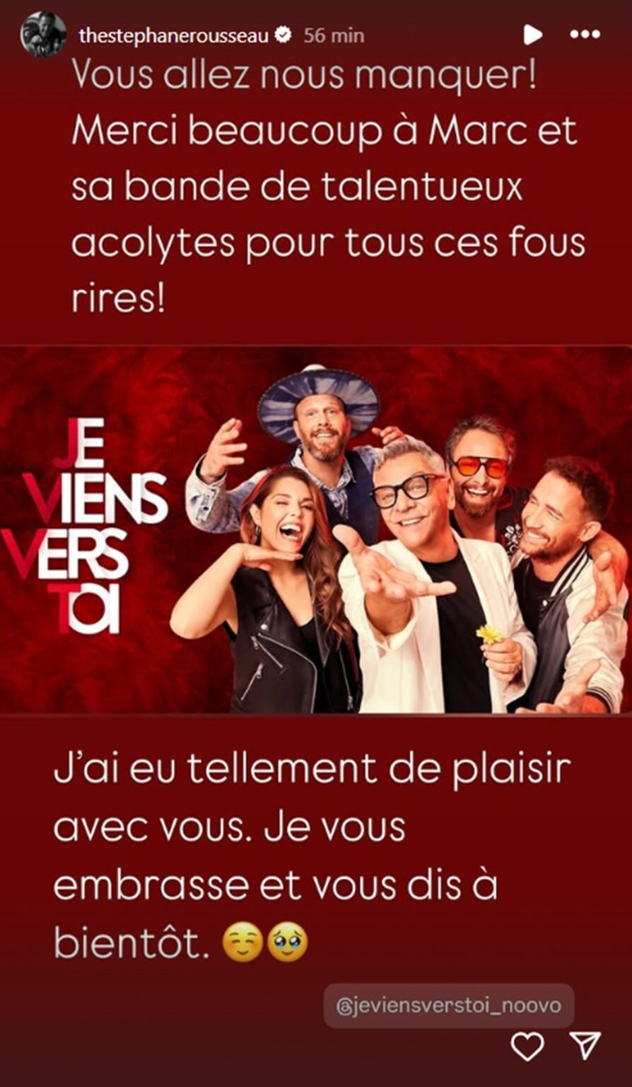 « VOUS ALLEZ NOUS MANQUER ! MERCI BEAUCOUP À MARC ET SA BANDE DE TALENTUEUX ACOLYTES POUR TOUS CES FOUS RIRES ! J’AI EU TELLEMENT DE PLAISIR AVEC VOUS, JE VOUS EMBRASSE ET VOUS DIS À BIENTÔT. »