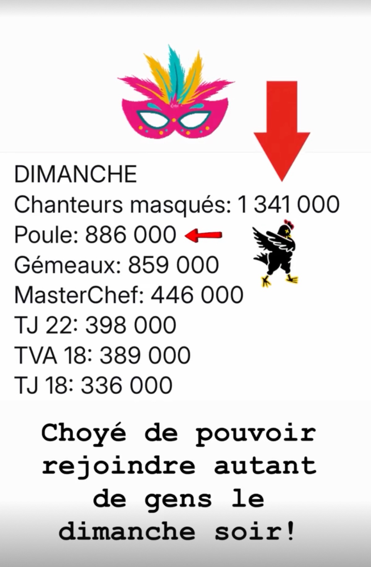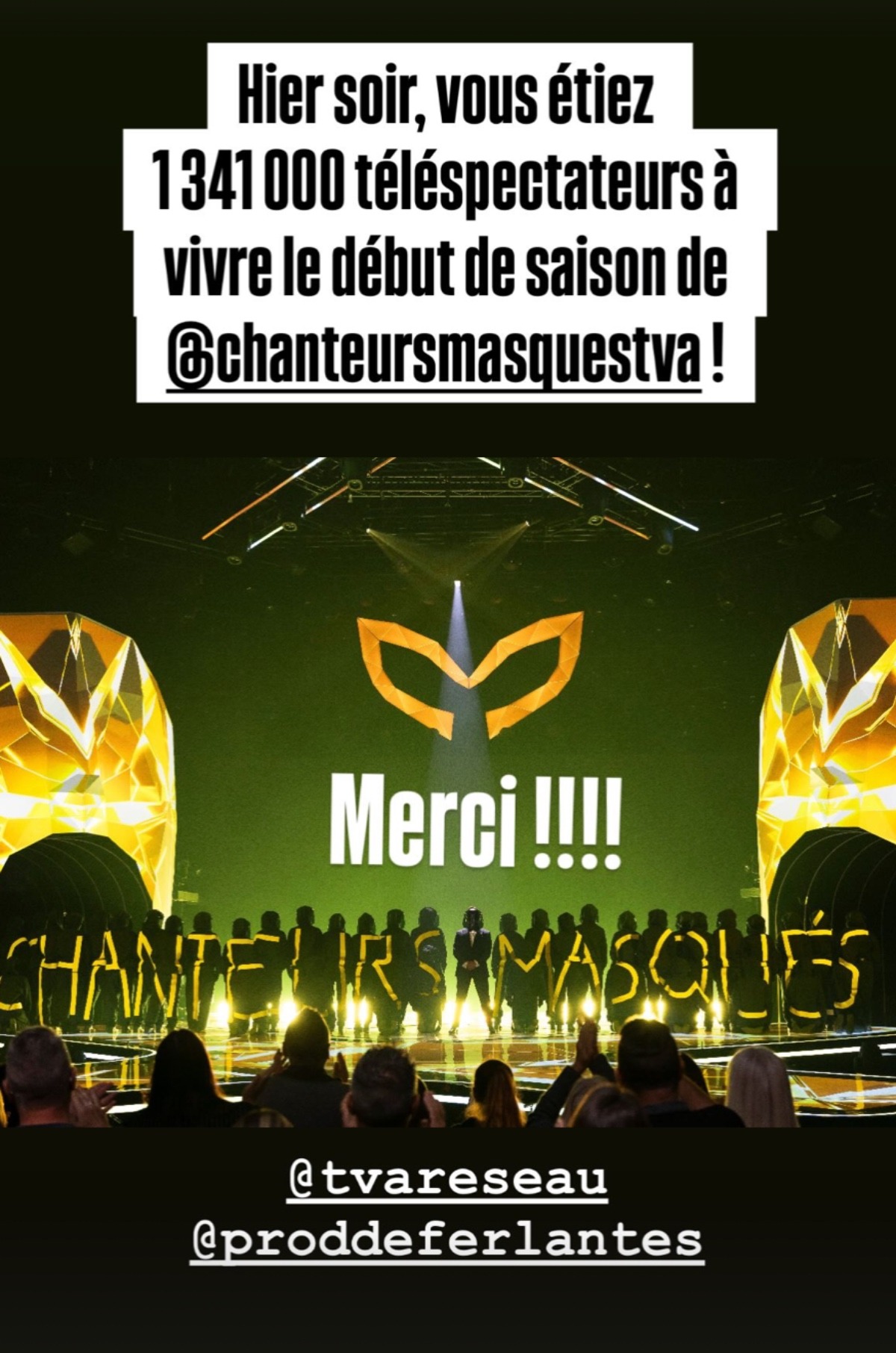 « Hier soir, vous étiez 1 341 000 téléspectateurs à vivre le début de saison de@chanteursmasquestva! »