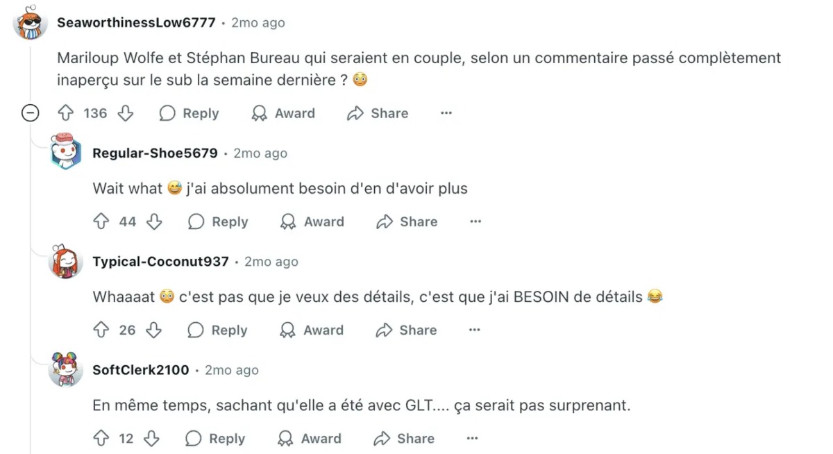 « Mariloup Wolfe et Stéphan Bureau qui seraient en couple, selon un commentaire passé complètement inaperçu sur le sub la semaine dernière? »