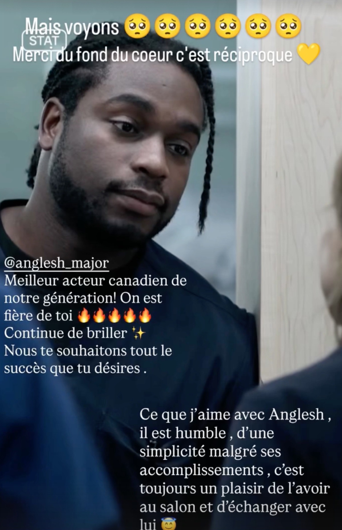 « @anglesh_major Meilleur acteur canadien de notre génération! On est fière de toi. Continue de briller. Nous te souhaitons tout le succès que tu désires. »