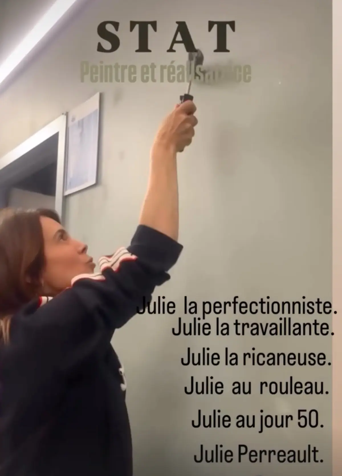 Dans une vidéo partagée par l’actrice Geneviève Schmidt, on peut voir Julie en train de corriger certaines imperfections d’un décor, sans doute en vue d’une scène à tourner dans les prochains instants…