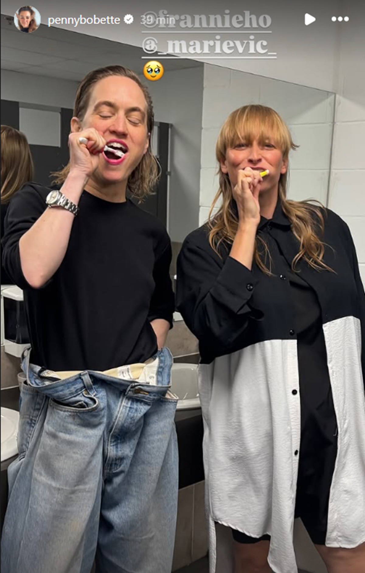 Ci-dessous, MarieVic qui pose une première fois, puis une seconde, en compagnie de Frannie Holder. Les deux artistes se brossent les dents, tout en posant pour la caméra: