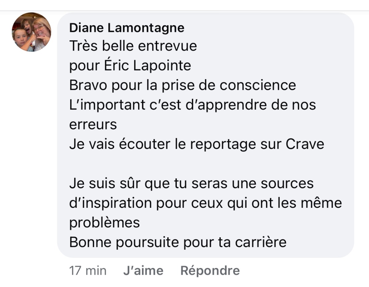 « Très belle entrevue pour Éric Lapointe. Bravo pour la prise de conscience. L’important c’est d’apprendre de nos erreurs. Je vais écouter le reportage sur Crave. Je suis sûr que tu seras une sources d’inspiration pour ceux qui ont les même problèmes. Bonne poursuite pour ta carrière »
