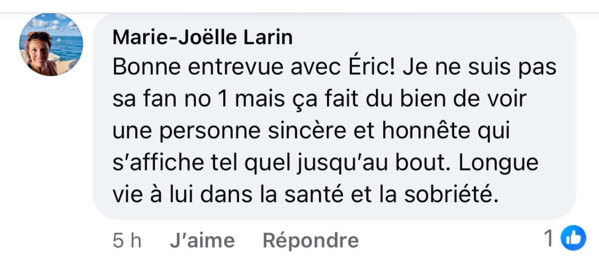« Bonne entrevue avec Eric! Je ne suis pas sa fan no 1 mais ça fait du bien de voir une personne sincère et honnête qui s’affiche tel quel jusqu’au bout. Longue vie à lui dans la santé et la sobriété. »