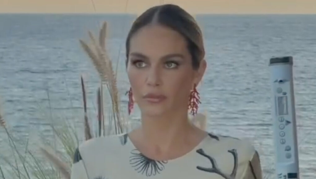 L’animatrice porte une robe bleue et blanche, ainsi qu’un rouge à lèvres de couleur vive: