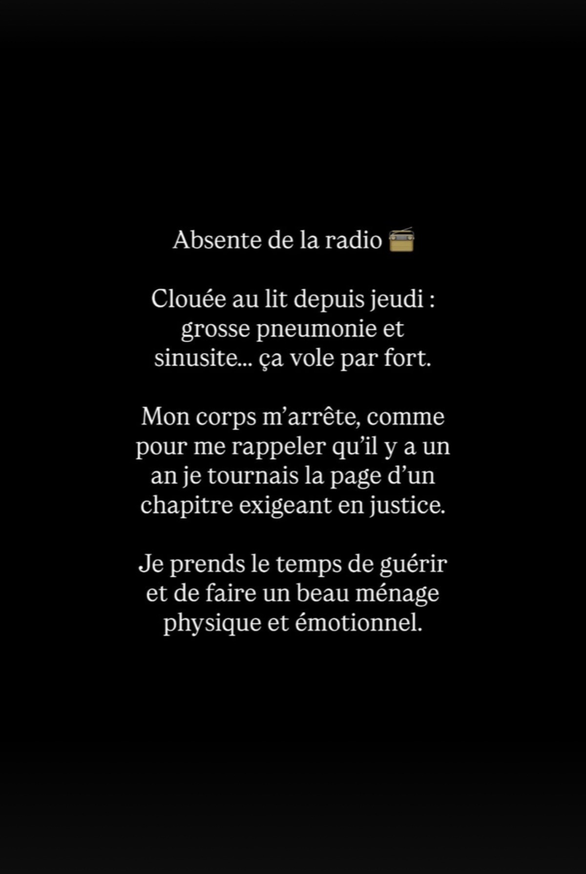 Voici les publications de Géraldine, dans lesquelles l’animatrice explique les raisons de son absence: