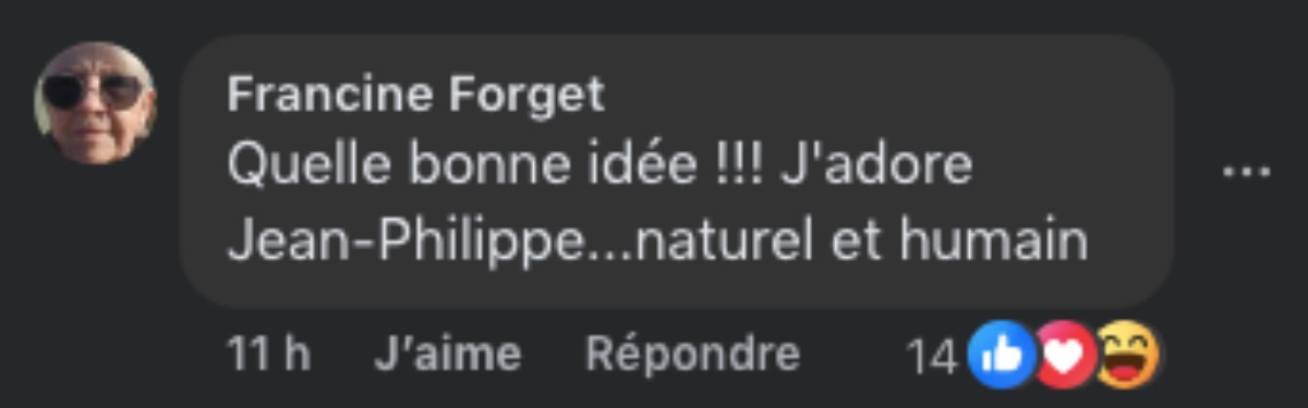 « Quelle bonne idée !!! J’adore Jean-Philippe…naturel et humain »