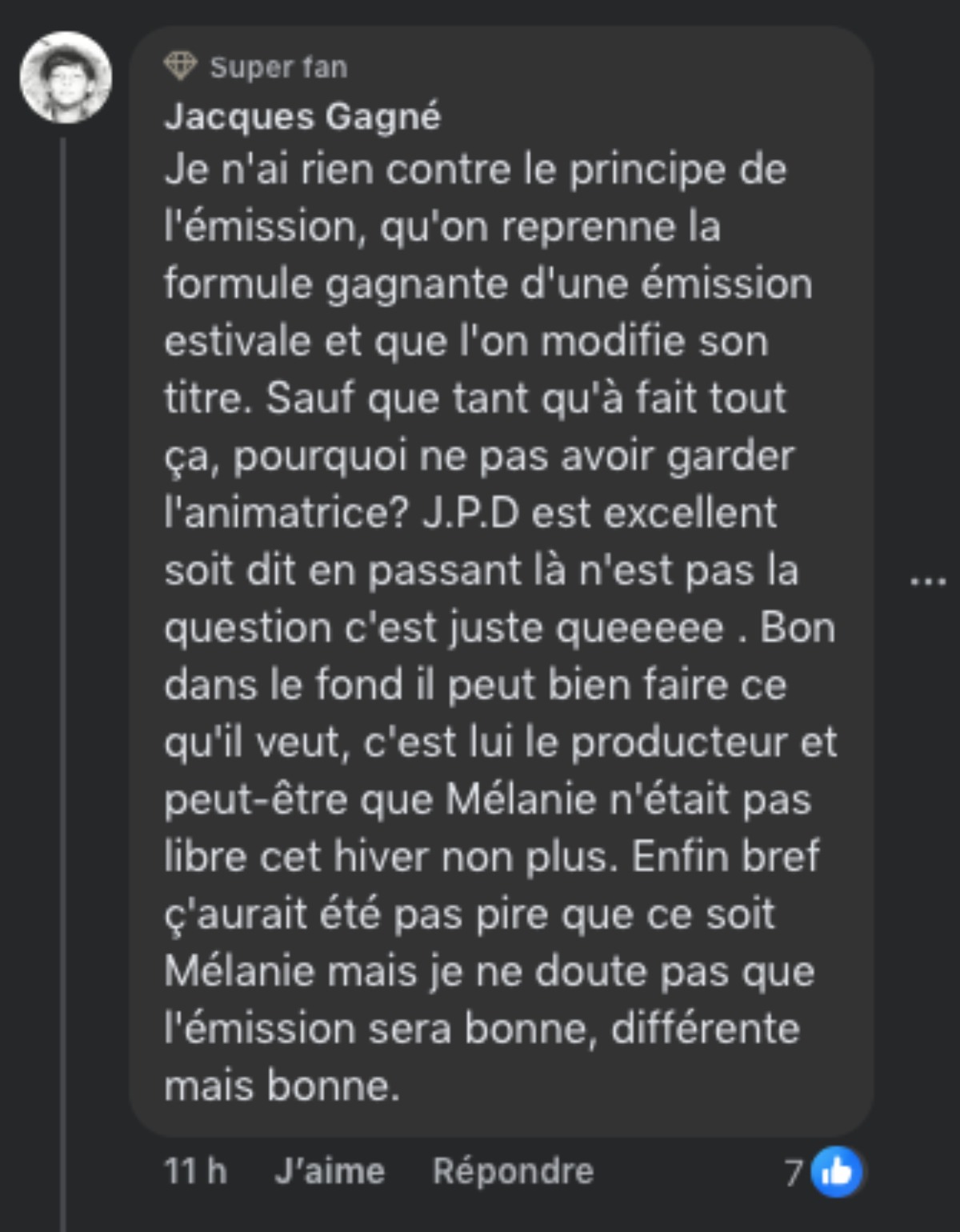 « Je n’ai rien contre le principe de l’émission, qu’on reprenne la formule gagnante d’une émission estivale et que l’on modifie son titre. Sauf que tant qu’à fait tout ça, pourquoi ne pas avoir garder l’animatrice? J.P.D est excellent soit dit en passant là n’est pas la question c’est juste queeeee . Bon dans le fond il peut bien faire ce qu’il veut, c’est lui le producteur et peut-être que Mélanie n’était pas libre cet hiver non plus. Enfin bref ç’aurait été pas pire que ce soit Mélanie mais je ne doute pas que l’émission sera bonne, différente mais bonne. »