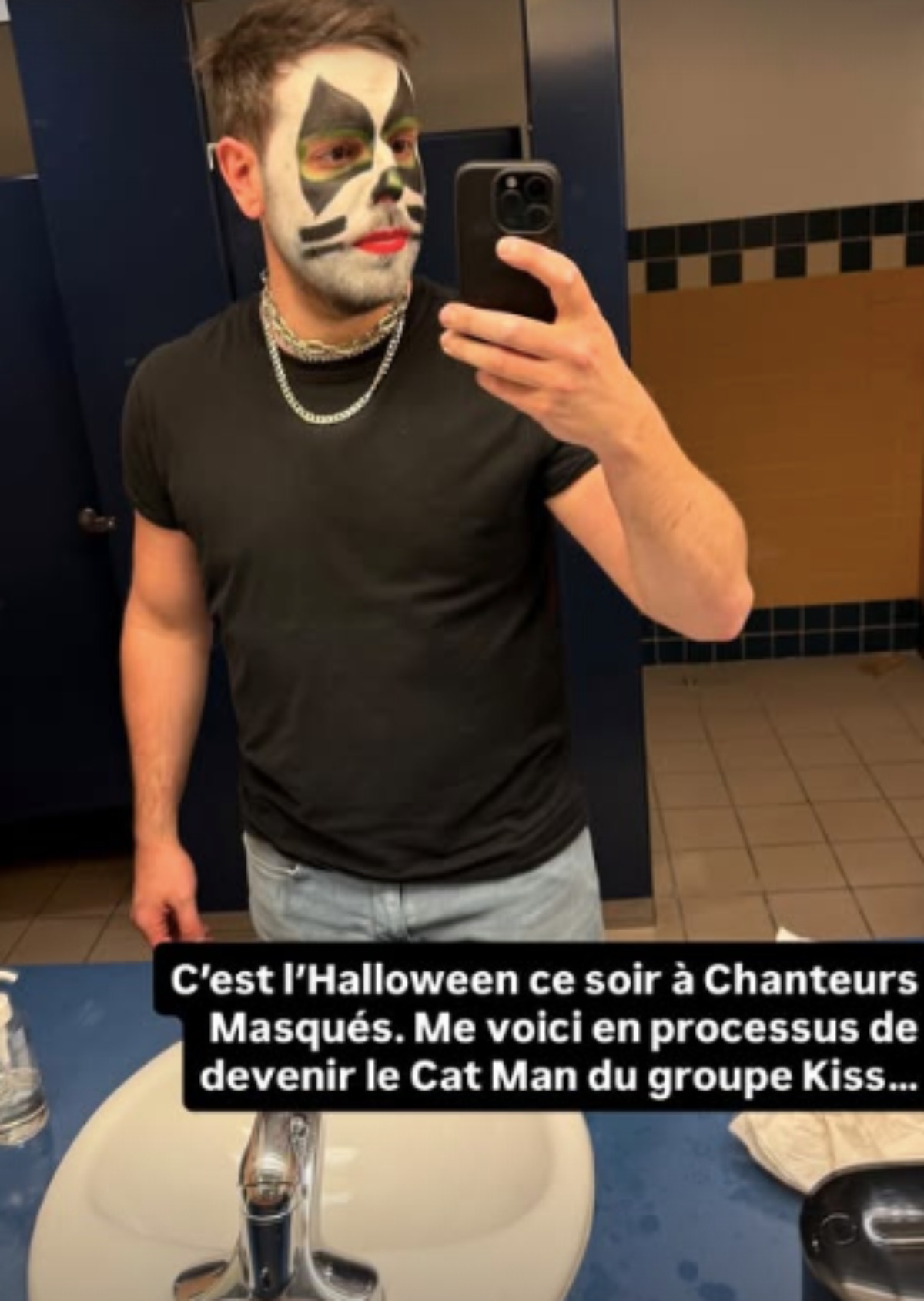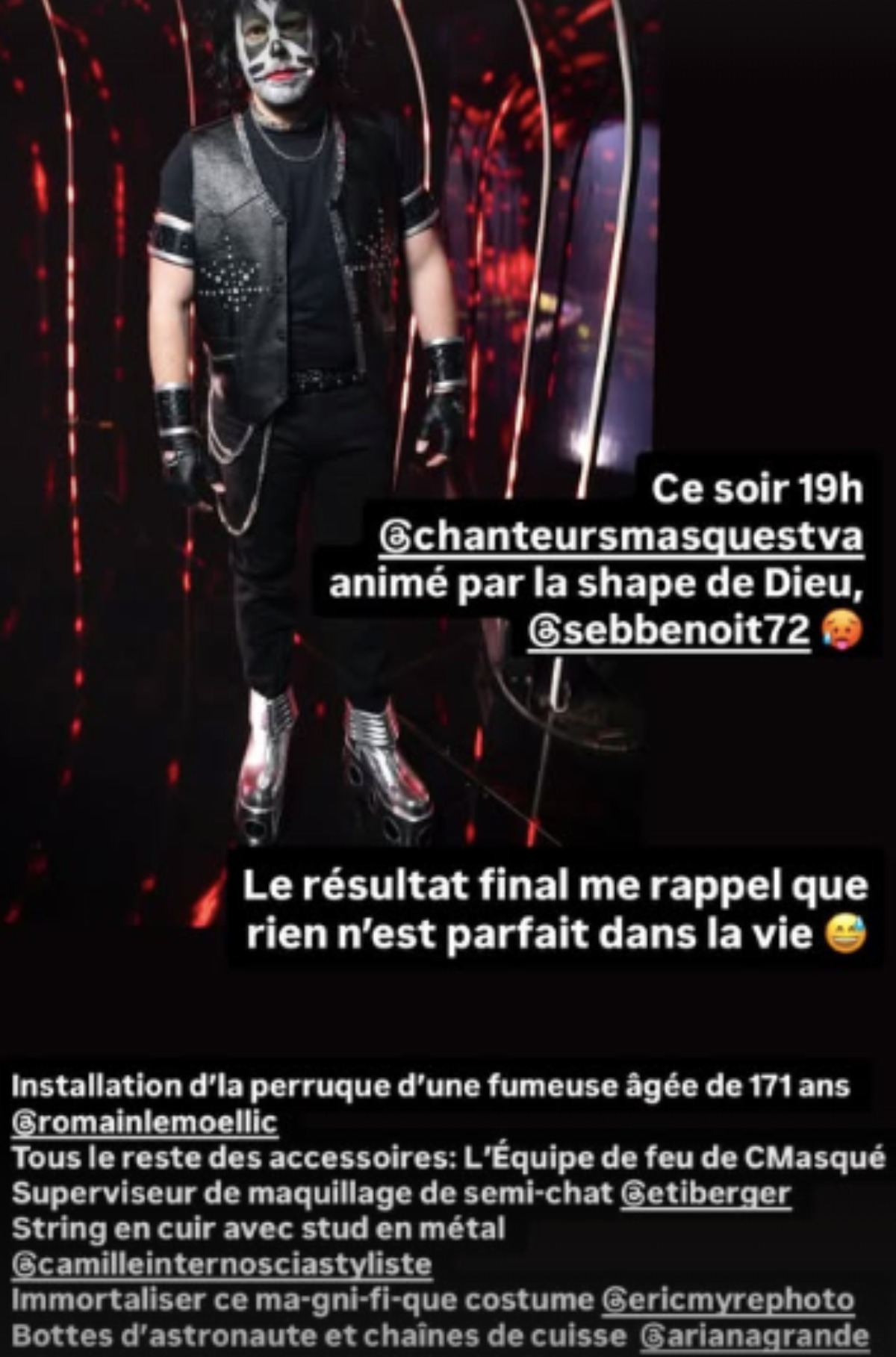 « C’est l’Halloween à Chanteurs Masqués. Me voici en processus de devenir le Cat Man du groupe Kiss… […] Ce soir 19h @chanteursmasquestva animé par la shape de Dieu, @sebbenoit Le résultat final me rappelle que rien n’est parfait dans la vie. Installation d’la perruque d’une fumeuse âgée de 171 ans @romainlemoellic Tous le reste des accessoires: L’Équipe de feu de CMasqué, Superviseur de maquillage de semi-chat @etiberger, String en cuir avec stud en métal @camilleinternosciastyliste Immortaliser ce ma-gni-fi-que costume @ericmyrephoto Bottes d’astronaute et chaînes de cuisse @arianagrande »