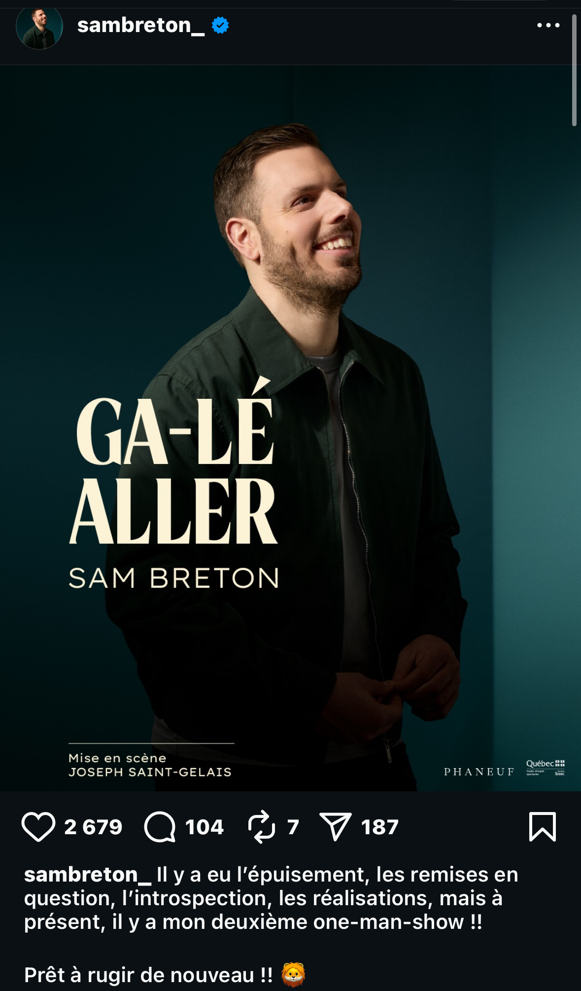 » Il y a eu l’épuisement, les remises en question , L’introspection, les réalisations, mais a présent, il y a mon deuxième one-man-show!!! Prêt à rugir de nouveau !! 🦁 »