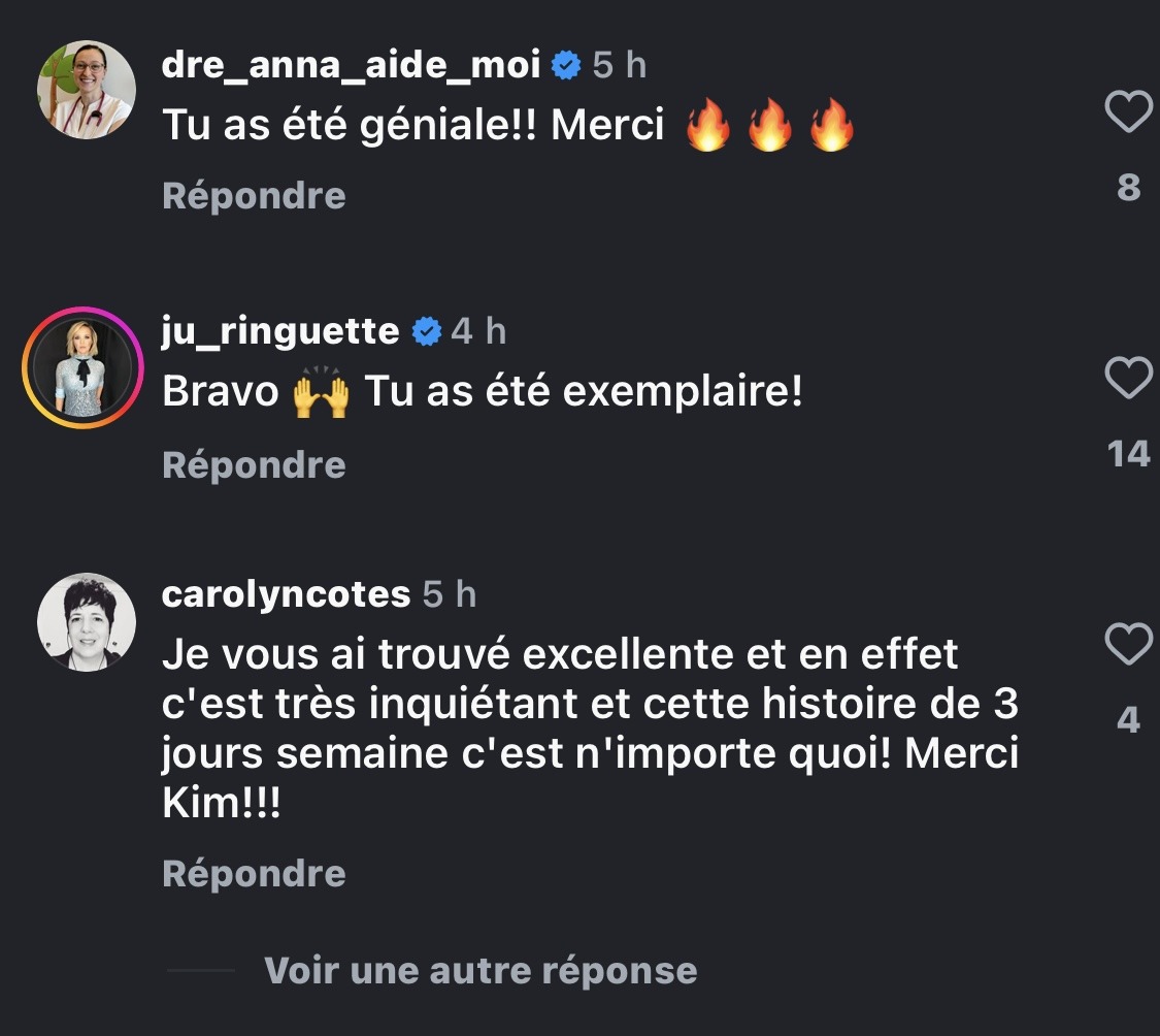 Après la diffusion de l’émission, la publication de Kim Lévesque-Lizotte a rapidement suscité une vague de réactions. Nombreux ont salué son courage et sa franchise, voici quelques-uns des messages dont celui de Julie Ringuette :
