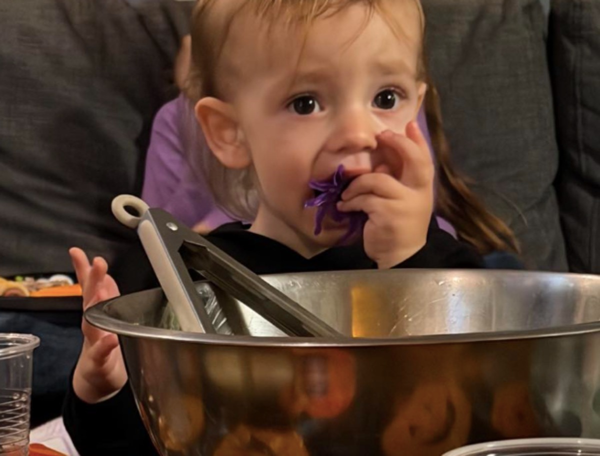 Il y a ici un peitt Groulx qui a mis la main sur un jujube en forme d’araignée. Il en goutte une patte: