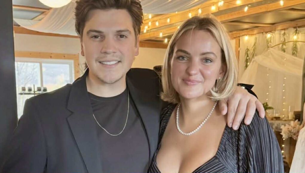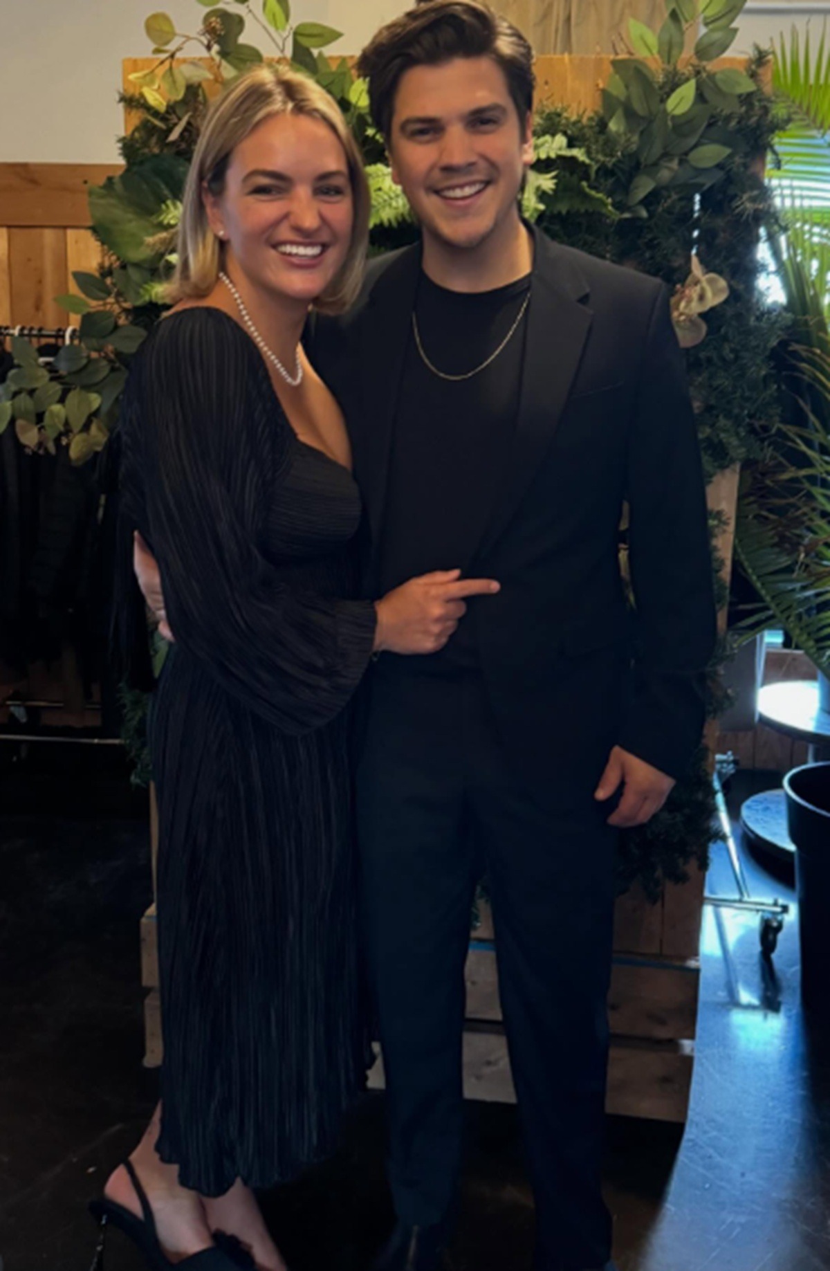 Ici, Ludovick Bourgeois et Olivia Rochon sourient pour l’objectif. Ils portent des vêtements sombres et chics, et des colliers assortis à leurs styles respectifs: