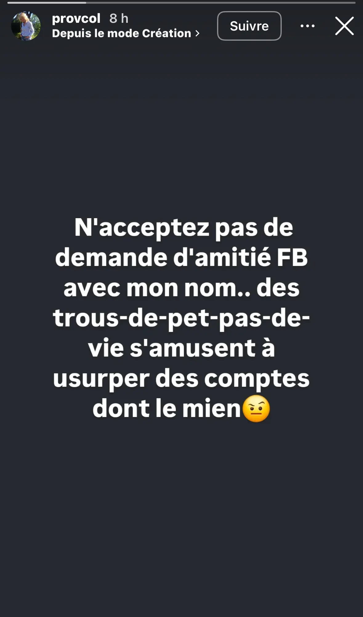 » N’acceptez pas de demande d’amitié FB avec mon nom.. des trous-de-pet-pas-de-vie s’Amusent à usurper des comptes dont le mien 🤨 »