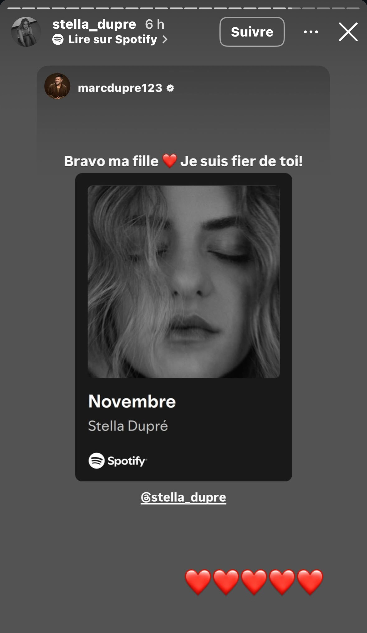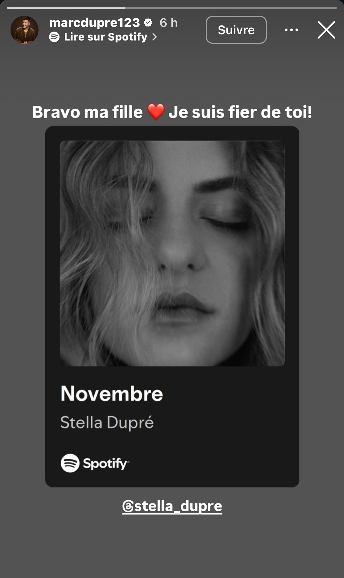En plus des commentaires de ses abonnés, son père Marc Dupré lui a écrit un petit mot pour la féliciter :