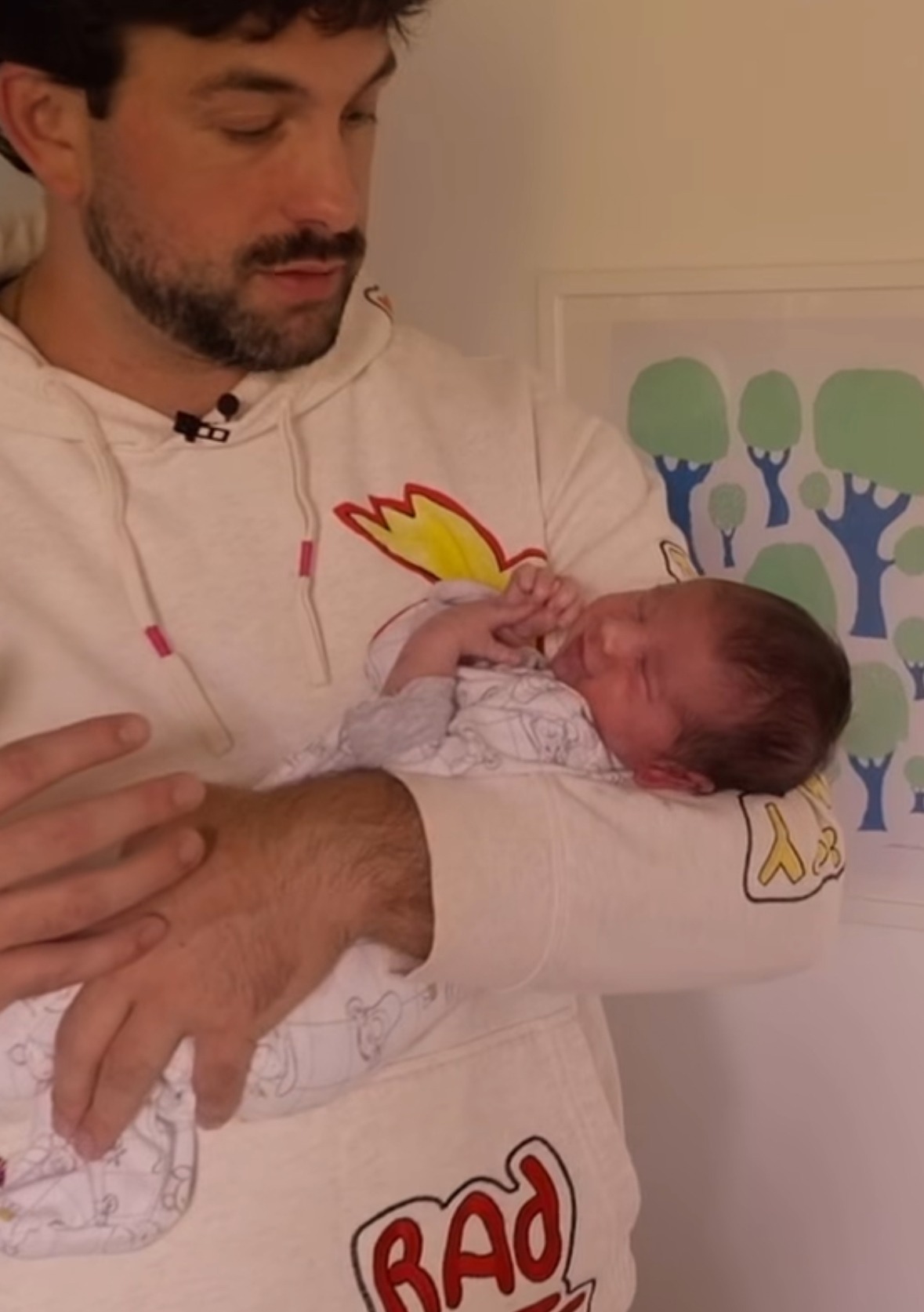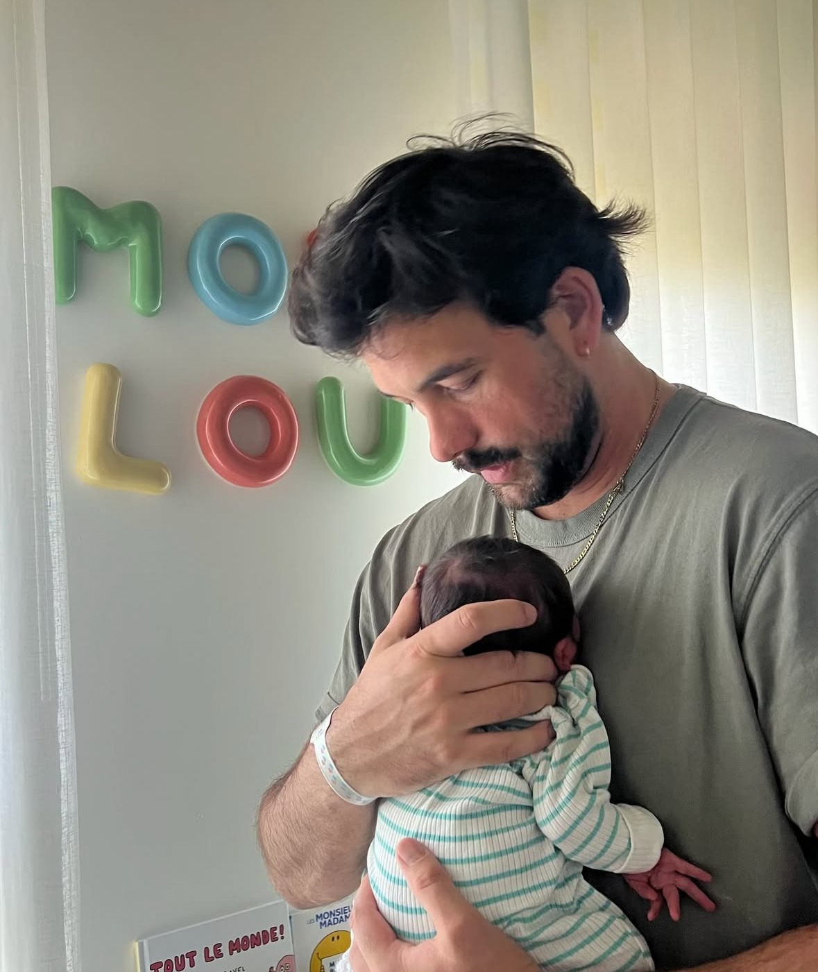 Félix-Antoine tient bébé Lou dans ses bras, et on peut voir ses traits.