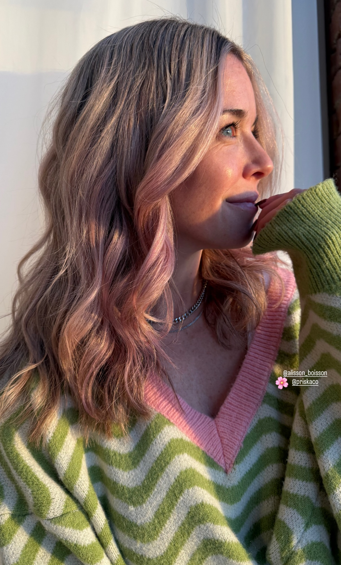 Il s’agit d’un geste audacieux que d’ajouter de la couleur à ses cheveux et cela lui va très bien! Le rose contraste avec ses yeux bleus, et c’est un excellent choix.