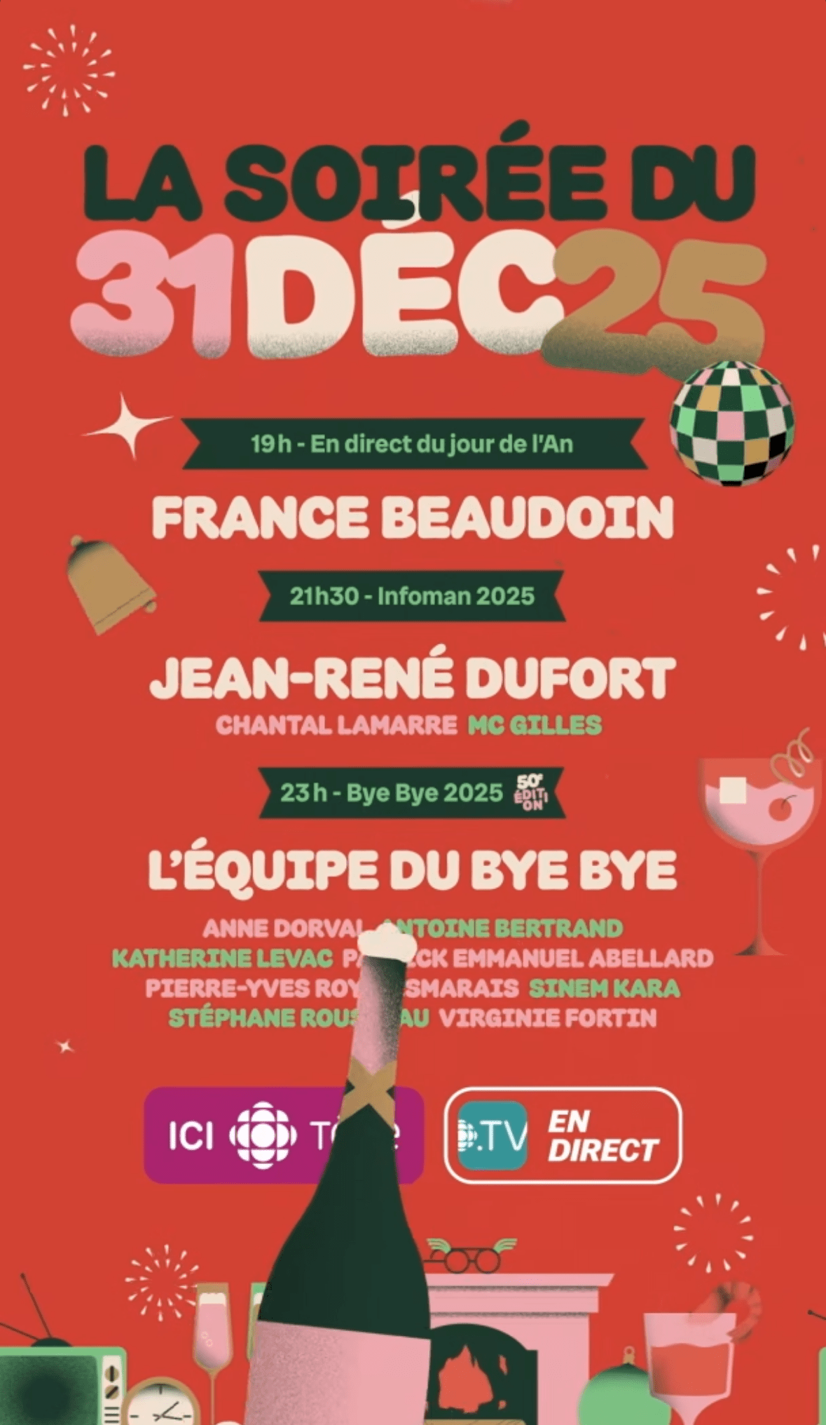 C’est donc toute une soirée qui attend les téléspectateurs le 31 décembre sur les ondes de Radio-Canada. On sait que plusieurs terminent toujours leur année avec le Bye Bye, Infoman ainsi que toutes les autres émissions.
