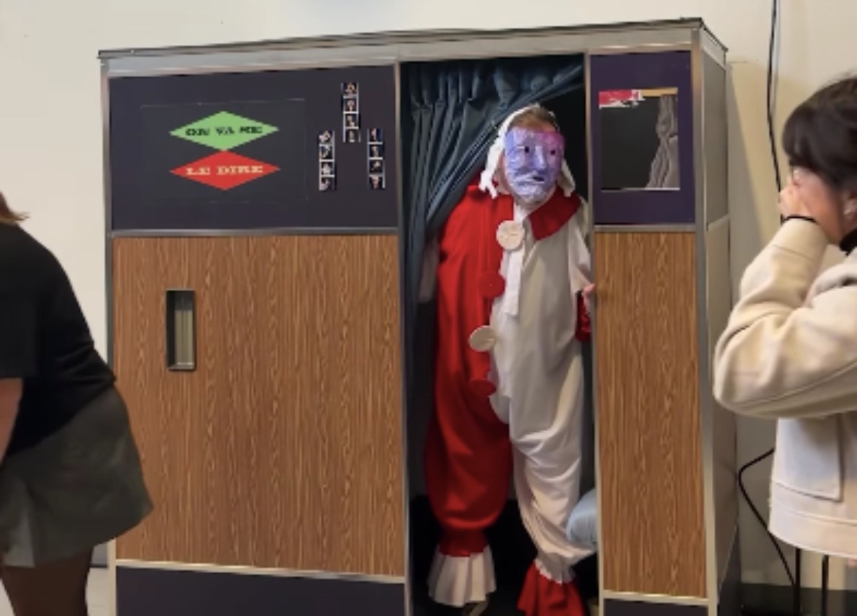 Dans la vidéo en question, on peut voir Vincent se dissimuler dans une cabine à photos. Seulement, celui-ci n’est pas reconnaissable, puisqu’il est couvert d’un déguisement et d’un masque. Caché derrière un rideau, il attend patiemment que les collègues de sa femme France passe à proximité de la cabine pour les surprendre.