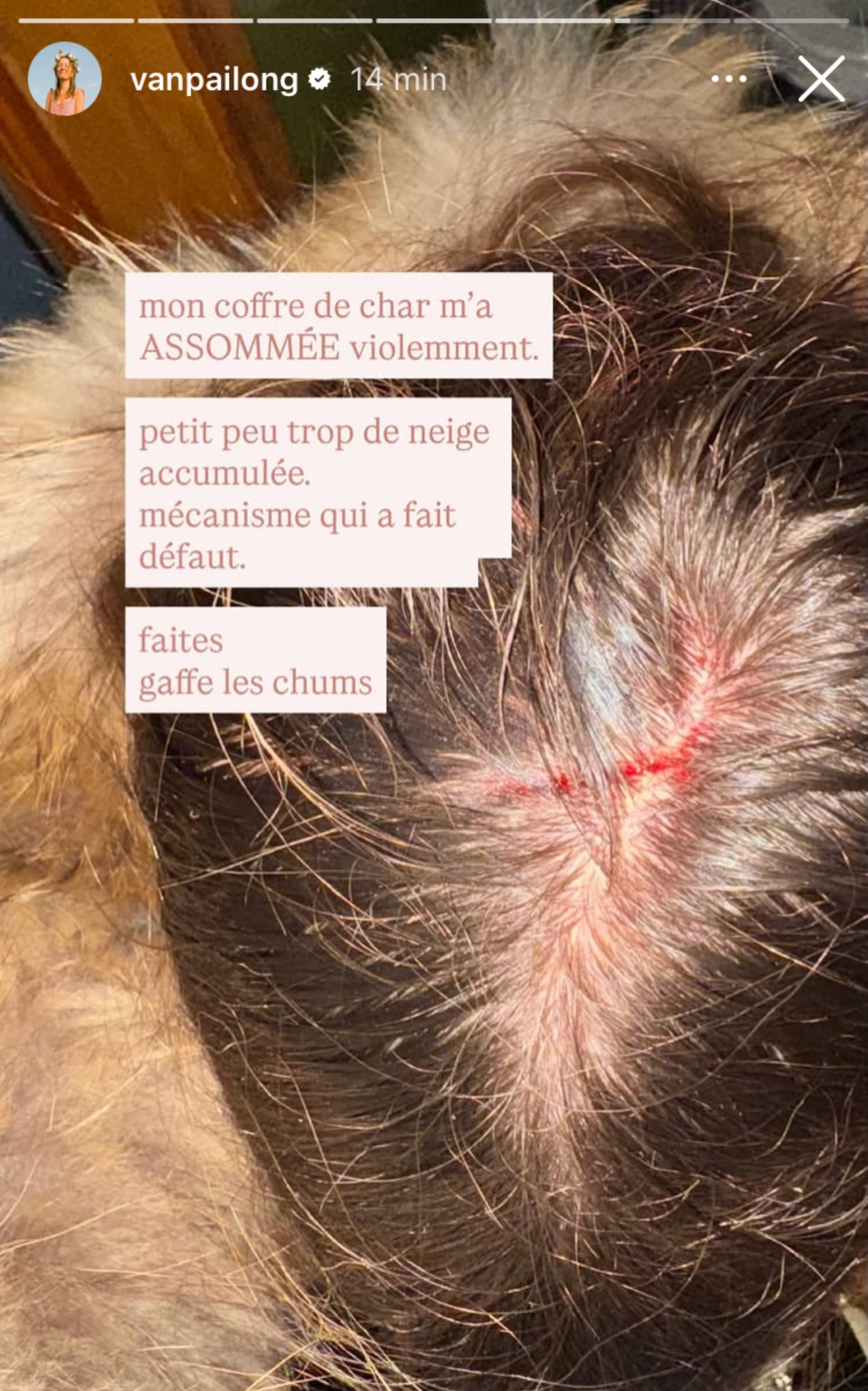 Elle a également partagé des images de son état actuel. Sur l’une des photos, on peut nettement apercevoir sa blessure, sur son cuir chevelu.