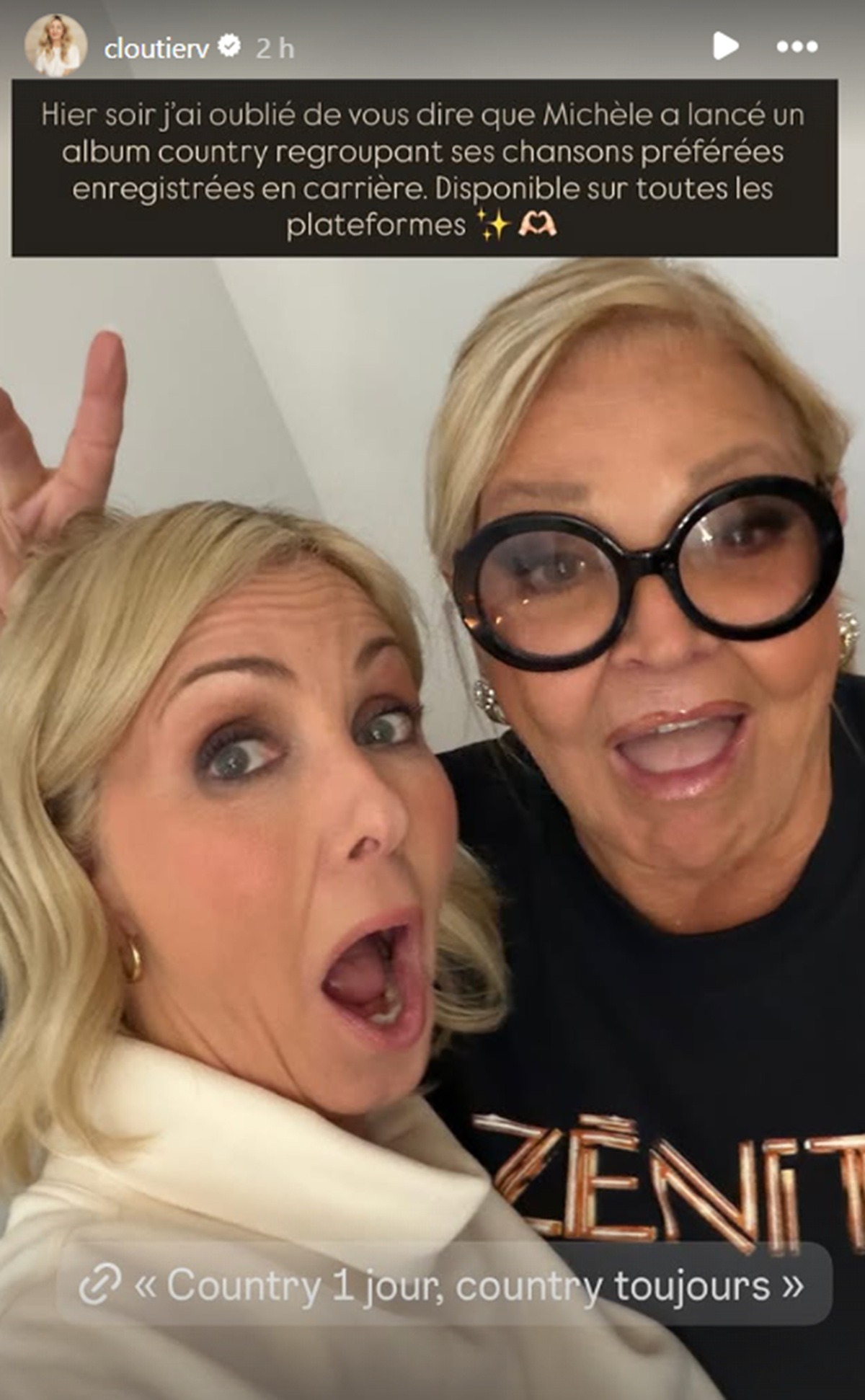 « Hier soir, j’ai oublié de vous dire que Michèle Richard a lancé un album country regroupant ses chansons préférées enregistrées en carrière. Disponible sur toutes les plateformes. »