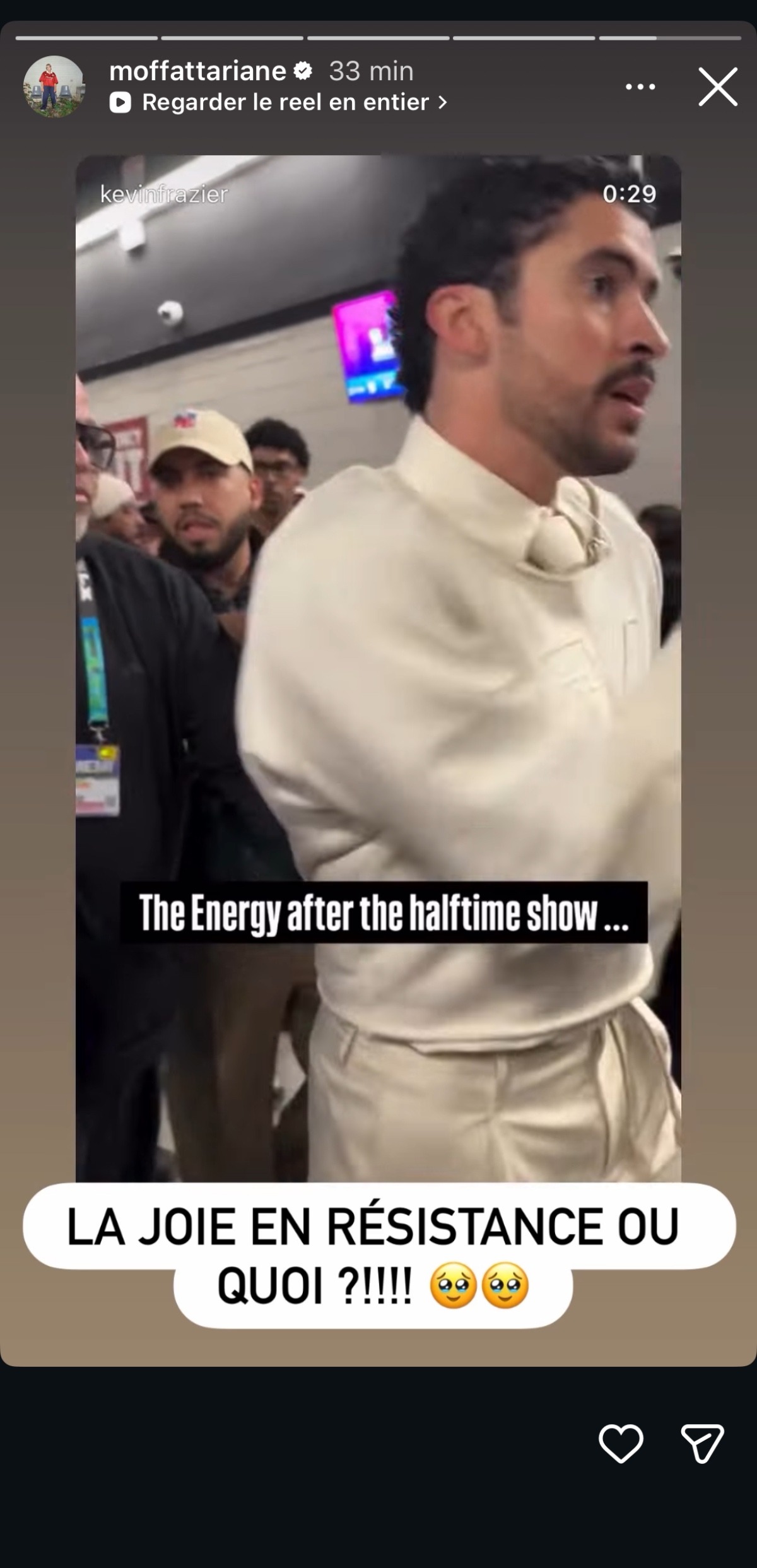 Le spectacle de la mi-temps de Bad Bunny semble d’ailleurs avoir ravi plusieurs fans qui attendaient ce moment avec impatience. On anticipait une mi-temps et des réactions à saveur politique, alors que Bad Bunny, d’origine porto ricaine, déteste ouvertement Trump et l’ICE et était le premier à produire un spectacle entièrement en espagnol pour le Super Bowl.