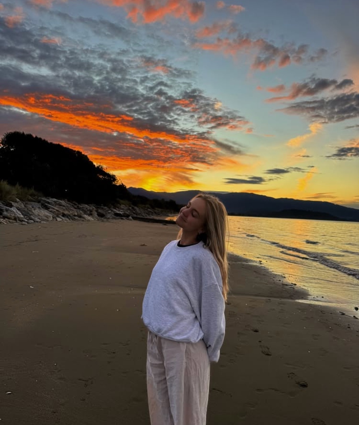 Dans cette première image, Ludivine profite d’un magnifique coucher de soleil. La lumière orangée se reflète dans les nuages, et la comédienne a l’air zen:
