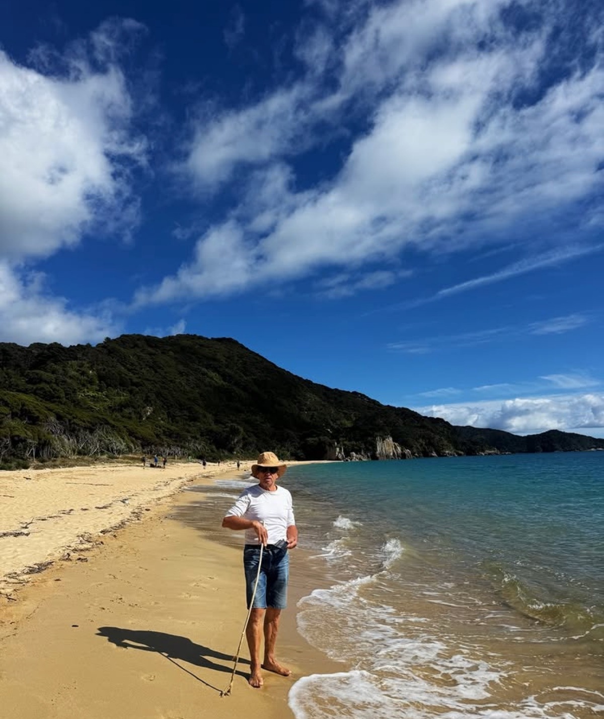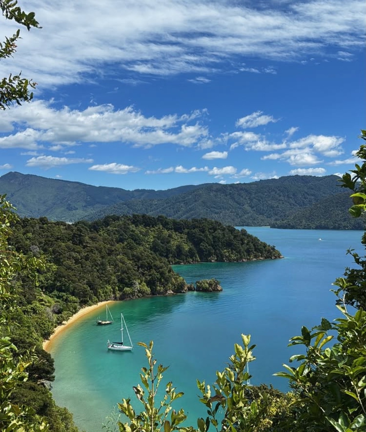 Un paysage de Nouvelle-Zélande. Sur l’eau voguent de petits bateaux blancs, contrastant avec l’eau d’azur: