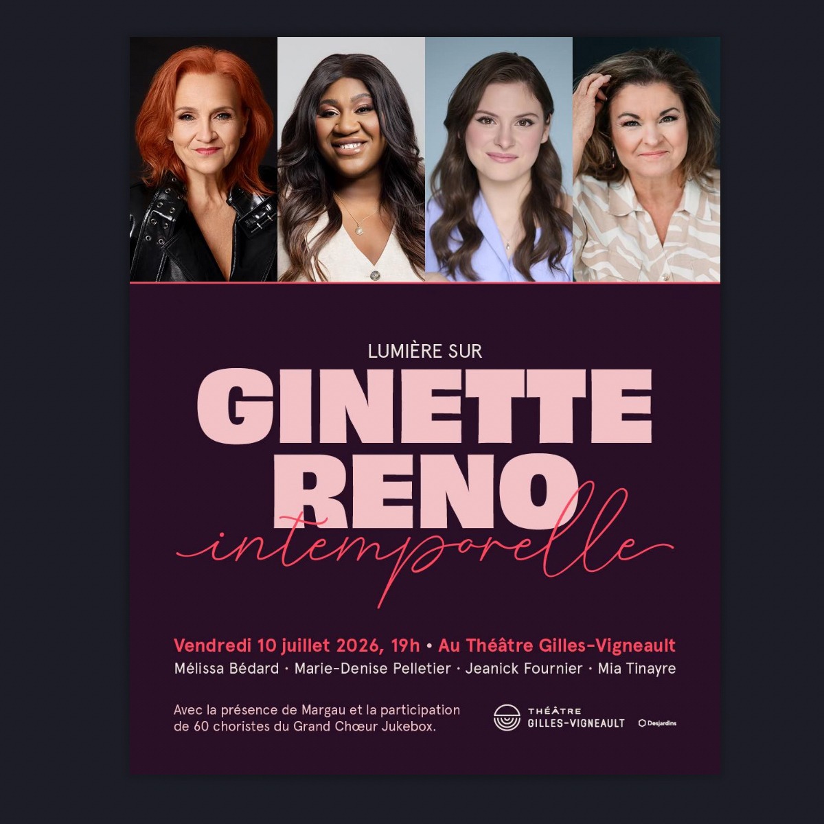 Pour l’occasion, Mélissa partagera la scène avec plusieurs voix féminines bien connues, dont Marie-Denise Pelletier, Jeanick Fournier et Mia Tinayre. Celles-ci revisiteront quelques-unes des chansons les plus marquantes du répertoire de Ginette Reno, lors d’un évènement pensé comme une célébration de son héritage musical.