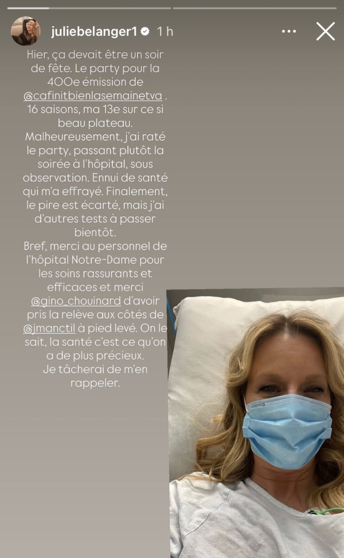 « Hier, ça devait être un soir de fête. Le party pour la 400e émission de Ça finit bien la semaine. 16 saisons, ma 13e sur ce si beau plateau. Malheureusement, j’ai raté le party, passant plutôt la soirée à l’hôpital, sous observation. Ennui de santé qui m’a effrayé… »