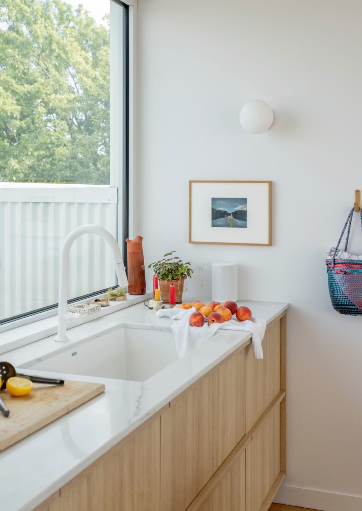 Ici, voici une photo d’un comptoir chez Karine. Près de l’évier, un nombre de pêches impressionnant a été disposé, prêtes à être dégustées par la comédienne: