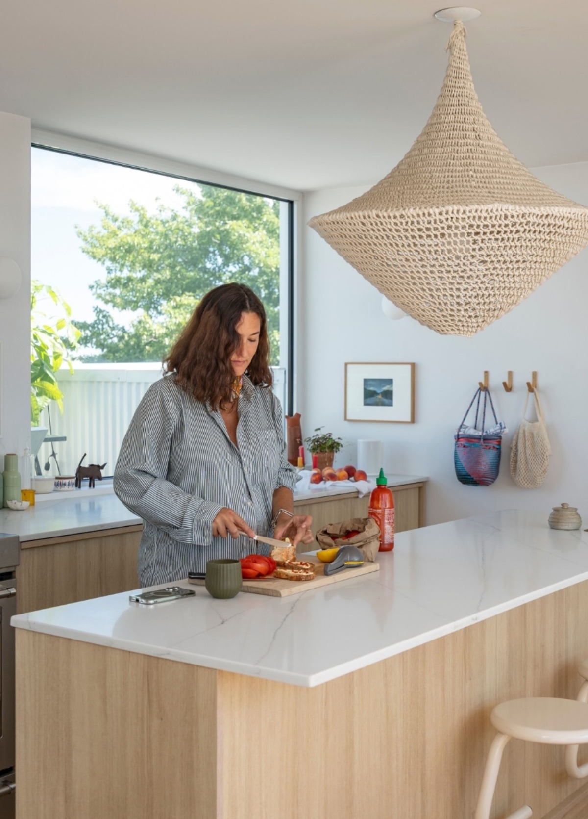 Dans sa cuisine, Karine se prépare un encas, à proximité d’une magnifique lampe en forme de toupie: