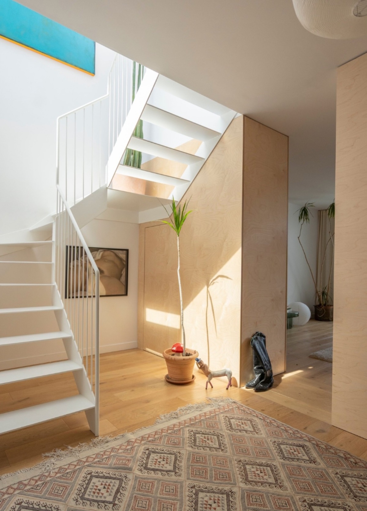 Cette cage d’escalier est tout à fait élégante, avec son petit palmier, qui s’agence parfaitement avec le décor minimaliste de l’endroit. Une paire de bottes a été déposée contre le mur: