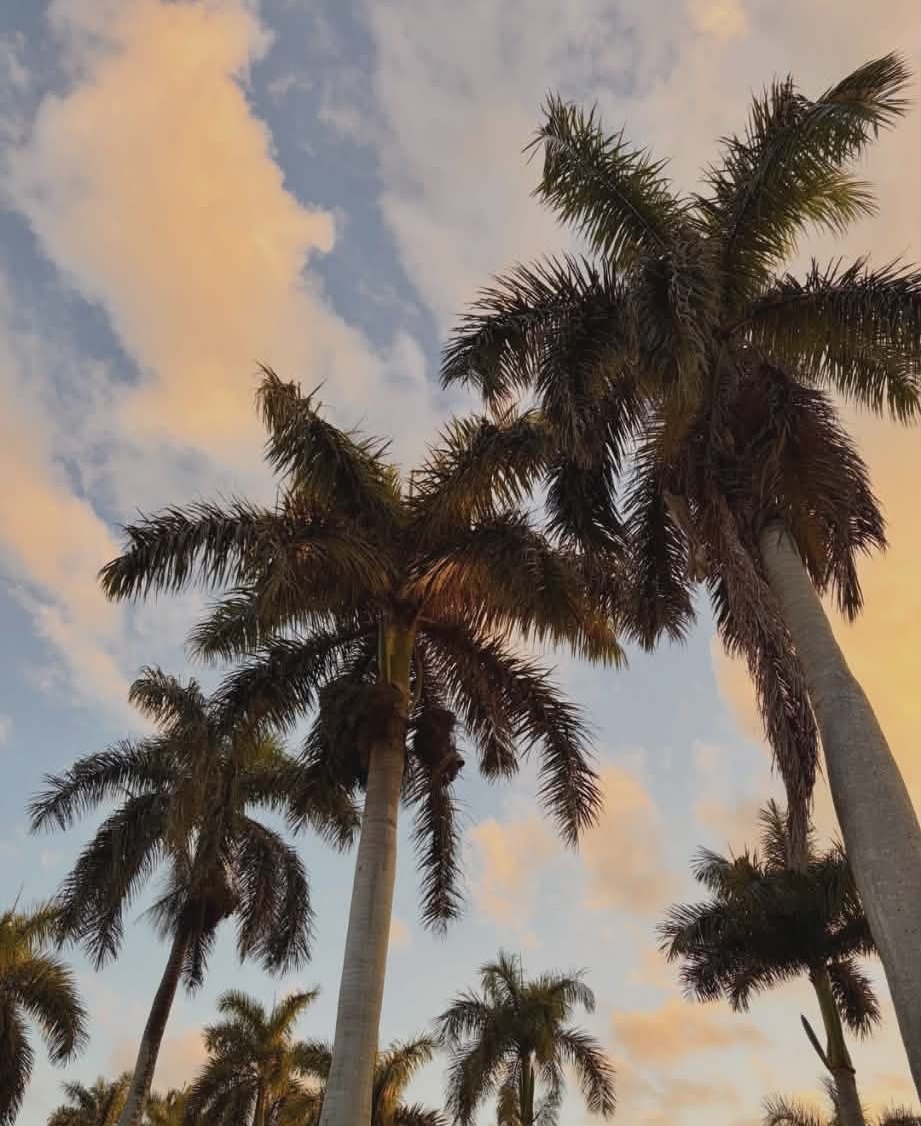 Une belle vue en contre-plongée des palmiers, sur fond de ciel couleur barbe à papa.