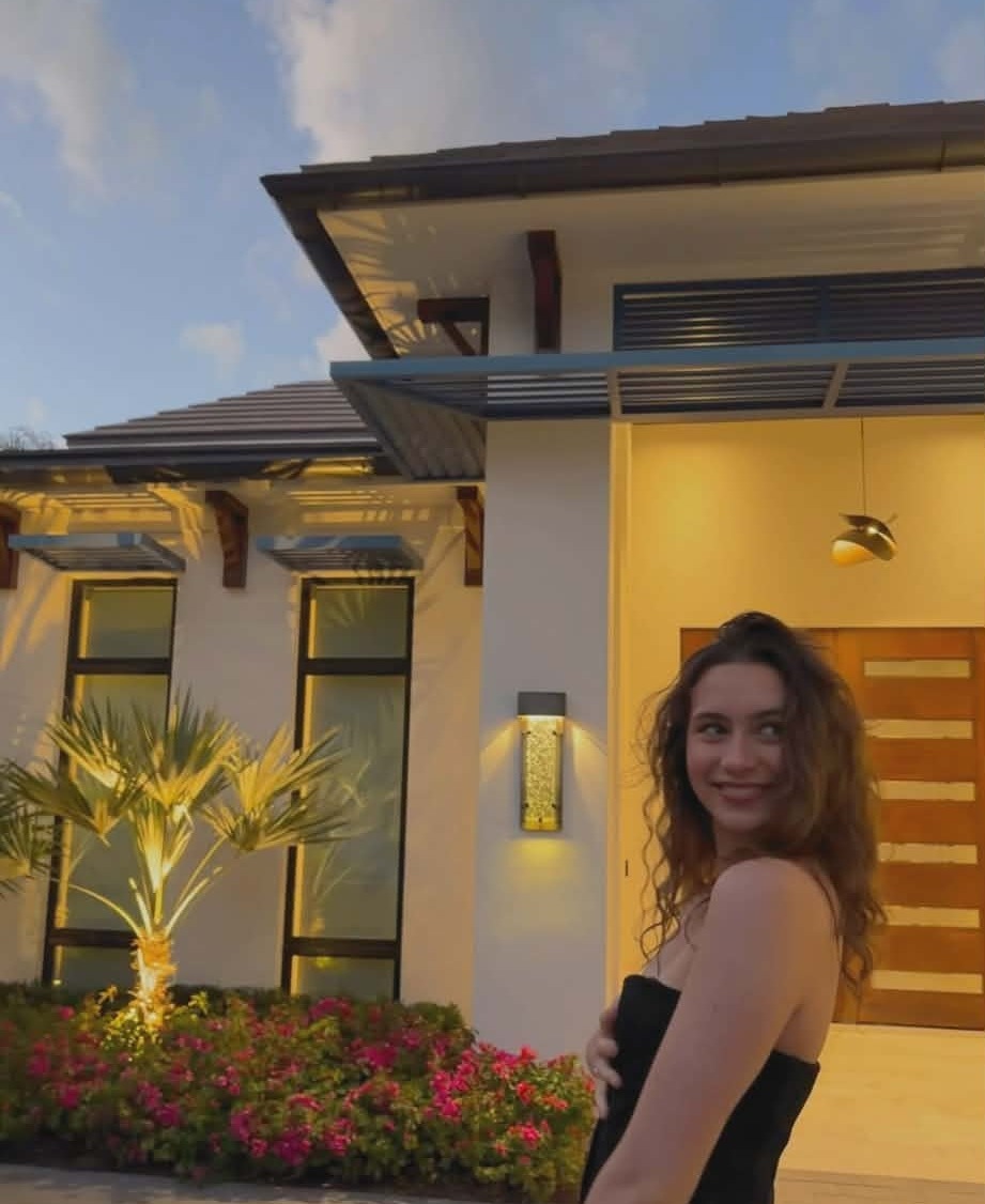 Romy prend la pose devant une luxueuse demeure.