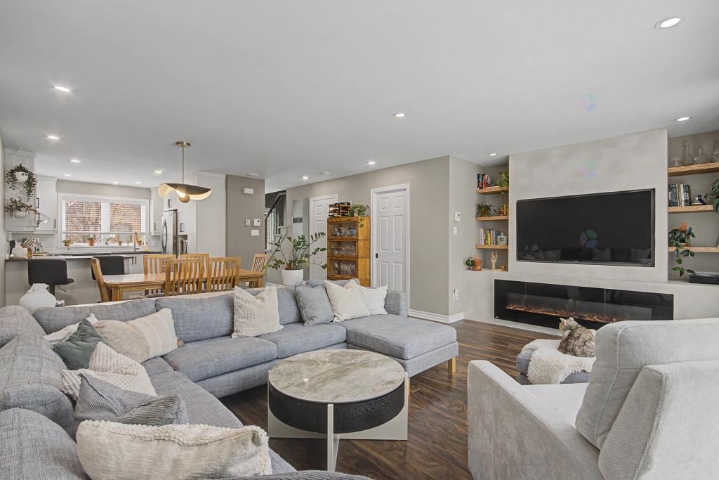 « Propriété style maison de ville de coin avec garage double, offrant une configuration recherchée. Unique propriétaire. Espaces de vie proposant une belle ouverture et une ambiance actuelle, avec un mur sur mesure intégrant télévision et rangement. Cuisine moderne au design épuré, alliant esthétisme et efficacité avec une optimisation intelligente des espaces de rangement. À l’étage, 3 chambres. Sous-sol aménagé avec accès direct au garage. Hall d’entrée pratique avec espace de rangement. Cour intime.Située dans un secteur enclavé,à l’écart de la circulation. Environnement calme et privé.Borne pour voiture électrique incluse. Près des services. »