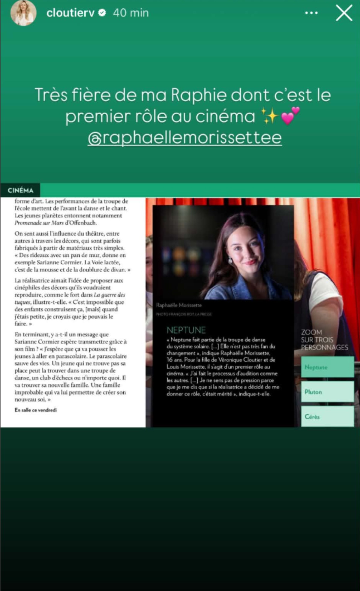 En effet, l’adolescente de 16 ans a publié un message à l’intention du public, afin de souligner la sortie en cinéma du film Au revoir Pluton, dans lequel elle joue.