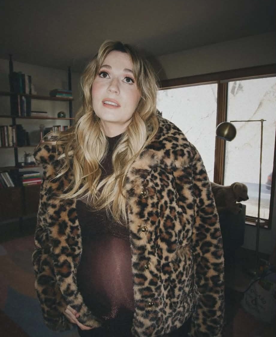 Et sous la veste, une robe qui souligne avec élégance sa silhouette de femme enceinte.