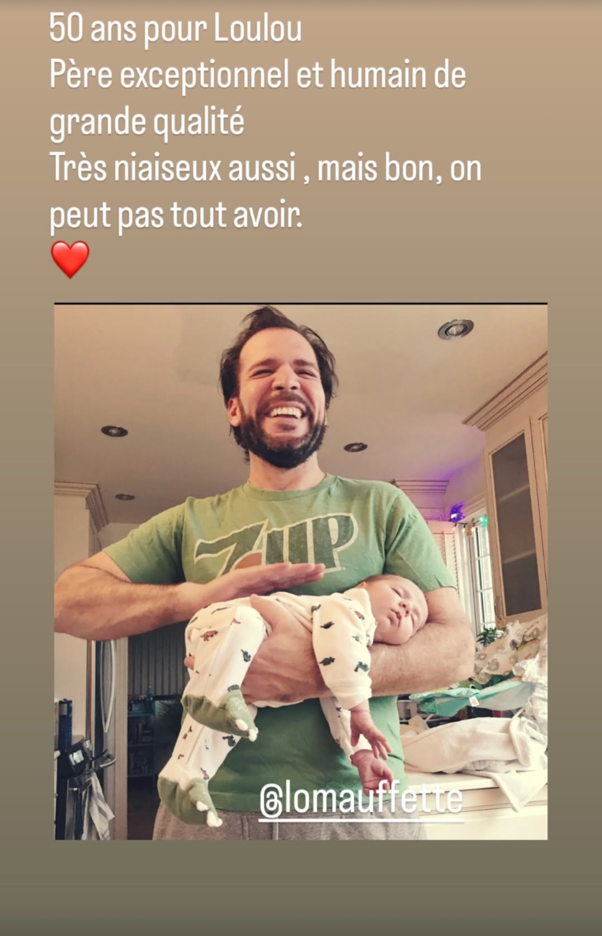 « 50 ans pour Loulou. Père exceptionnel et humain de grande qualité. Très niaiseux aussi, mais bon, on peut pas tout avoir. »